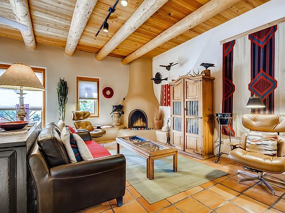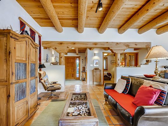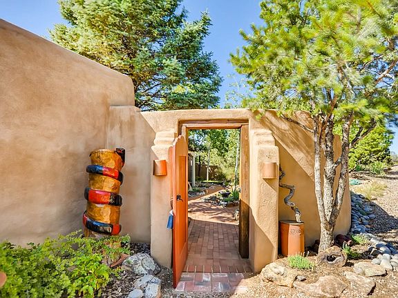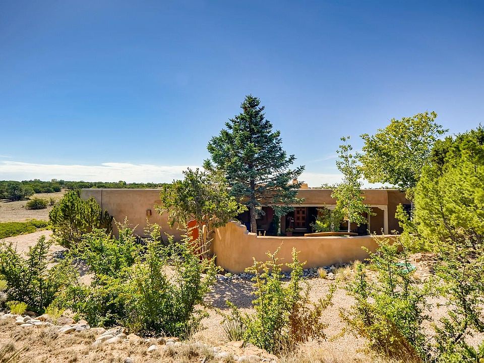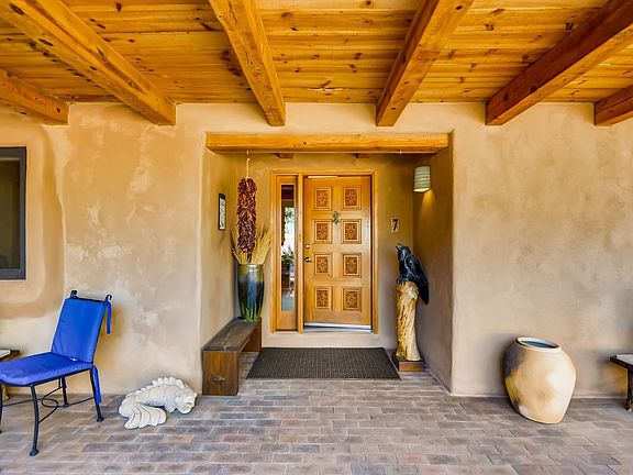 The Perfect Eldorado Retreat!! Located bordering a 62 acre greenbelt, this custom built passive solar by Shaylube Construction reflects the essence of Santa Fe ambience both inside and out. Gleaming saltillo tile floors, deep plastered adobe walls, beam ceilings throughout and hand crafted adobe kiva fireplace. Natural gas radiant heat, 2 master bedroom suites plus a separate guest/ office accessing a 3rd bathroom. A gated walled courtyard with deep portal for summer shade on the north side, a large brick patio with view portal and rabbit proofed landscaping on the greenbelt sunset side and an east portal for early coffee or evening BBQs. To see it is to love it, close to paved roads with easy access to enjoy all that Eldorado area community offers plus only minutes into historic Santa Fe.
