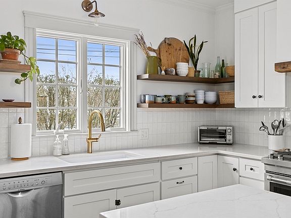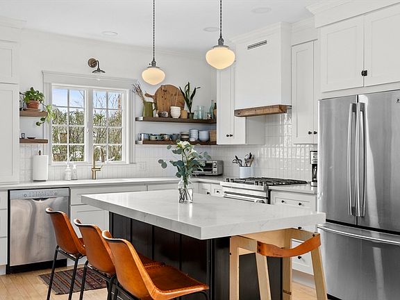 CHARMING and SUNNY renovated Antique Farmhouse with 9' ceilings and front and back staircases, just a stones throw to Hingham's great shops and restaurants. A newly renovated Kitchen boasting a large island, stainless appliances, quartz countertops and spacious dining area is the heart of the home. There's a cozy family room off the back of the house and a spacious, sun-filled living room in the front of the house. A large mudroom with radiant heat and custom built in bench provides a great drop zone before entering the kitchen. The upstairs features 4 bedrooms all with pine floors and 3 with closet systems. Large bath with new tile surround and custom linen cabinet. Bonus space with ship lap walls in the recently refinished walk up attic. Beautiful blue stone patio with stone walls for outdoor dining and relaxing. Fenced in yard. Newer gas heating and central air and Town Sewer! This is an in- town Gem!!! Walk to the train or just a short drive to the commuter boat.