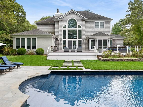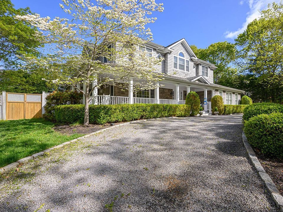 sf residence which also features a quintessential Hamptons covered front porch accented with white columns. The main living room has a wood burning fireplace and double height Palladian windows making this gem bright and sunny. An open floor plan with hardwood floors leads to the large kitchen with all new top-of-the-line appliances and formal dining room with a second fireplace and bar area . The primary suite is located on the first floor with its own sitting room. Three additional guest rooms, all queen sized beds, are located on the second floor with one ensuite and two that share a full bath. The 4th upstairs room is set up with a king sized sofa bed ensuite and serves as an office/den. A fun filled entertainment space including a gym and pool table is located on the renovated lower level. Outside is a gazebo with plenty of entertainment space abound with a heated pool and large surrounding patio and deck There is a multi zone Sonos system inside house and outdoors for further enjoyment. Great house in a fabulous location sure to delight .