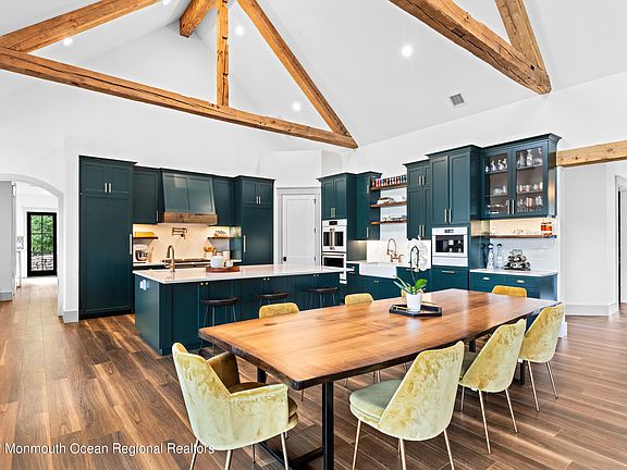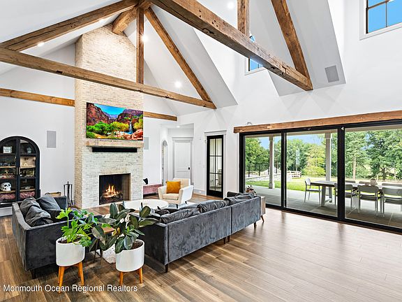Expertly built & laid out on over 20 acres of equestrian perfection in Colts Neck is the modern-farmhouse of your dreams, nestled into idealistic Clover Hill, all within an hour of NYC. At the end of a cul de sac, beyond the stone pillars this newly built compound awaits you, your toys, & your imagination. Infused with the essence of Rock 'n Roll, from the exposed beams, to the detached garage currently housing the owners classic car collection, to the replica 50s-style cabana kitchen. Balanced w/ modern black-framed windows, a soaring open-floorplan, EV charger, & solar. Absorb the breathtaking views of the lake over coffee on the covered back patio before tending to the alpaca in your stable.