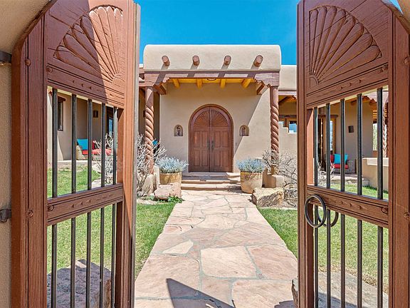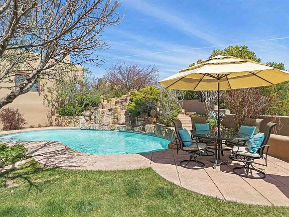 Classic Hacienda Residence with 3 Bedrooms, 3 ½ Baths, Family Room & Den/Office in 4700 square feet with some Sangre de Cristo & Sandia Mountain Views. A Sparkling Pool with cascading Rock Waterfall as well as a Sauna & Whirlpool Tub in the Master Bath make this home a self-contained Resort for your friends & family. The water in the Pool reflects the Santa Fe blue skies and the Classic Architecture reflects all the best of Santa Fe - Hand-carved columns, doors & lintels as well as massive vigas with split cedar latillas to show off the ceilings. Numerous nichos & built-in shelves abound for your special artifacts. Living Room is centered around an architecturally distinctive fireplace and adjacent Family / Game Room has a Wet Bar, Media Area & Kiva Fireplace. Kitchen has large island, casual eating area, 4-foot Viking Stove, 4-foot Sub-Zero refrigerator, Farm Sink and Large Walk-in Pantry. Master Bedroom has a shepherd's fireplace, generously-sized retreat area, huge walk-in closet, steam shower, whirlpool tub, sauna, A/C unit & private portal. Conveniently located in Estates I of Gated Las Campanas, it's just 12 minutes to shopping at De Vargas Center. Classic architecture, convenient location, sparkling pool and sauna make this home a veritable retreat from the ordinary!