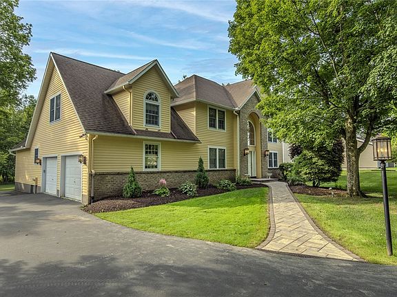 This contemporary colonial is located on a partially wooded, .63 acre property in the upscale South Woods area. From the driveway entrance, a pair of stone pillars and two lamp poles lead to a 2-car garage. The home's entrance hall presents a cathedral ceiling and the main staircase. The kitchen, dining room, family room, and living room (with cathedral ceiling, gas fireplace, and wet bar) are located on the 1st floor, as are a full bedroom and en-suite bathroom. The kitchen includes a dishwasher, gas stove, microwave, garbage disposal, two side-by-side refrigerator-freezers, a 250-bottle wine refrigerator, a walk-in pantry, and a laundry area. On the 2nd floor are the master bedroom and bathroom, together with two additional bedrooms and a bathroom. A "bonus room" (above the garage) may be used as a study, office, exercise room, or bedroom. All bathrooms are updated. There are walk-in closets in the first-floor and master bedrooms. All ceilings are accented with swirl textures. Heating and Central A/C operate on a 2-zone system, with hot water supplied by a hot water tank and a tankless water heater. The front walkway, porch, and backyard deck were reconstructed in 2025.