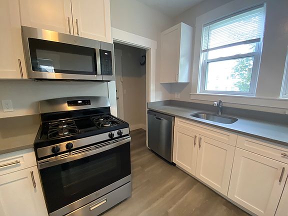 This Beautiful Apartment is situated near the commuter rail. Completely renovated with all stainless steel appliances. Hardwood flooring, spacious bedrooms with ample closet space, lots of windows providing tons of natural light and pleasant living room both with gleaming hardwood floors. Tiled full bath with tub/shower alcove. Private back porch! water/sewer/trash included in rent street parking 12 month lease credit and background checks call for details