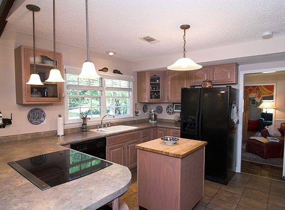 Follow the paver pathway to this lovely 3 bedroom, 2 full bath, 2230 sq ft home. Lounge by the pool under the retractable awning or in your hammock lakeside. Enjoy sunsets from under the Majestic ancient Live Oak. Kayak and fish from your backyard oasis. Almost an acre of land. Cathedral ceilings, wood fireplace, sun room, shed, dual HVAC, Koi pond, circle drive all on a no outlet street.