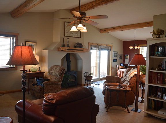 Pristine condition, pride of ownership shows throughout. Enjoy unobstructed views of Carter Mountain from your covered, wrap-around deck. The well-designed floor plan has vaulted ceilings with wood beam accents, open living area and a spacious master bedroom with granite counters in the bath The lower level is completely finished. MOTIVATED SELLER...BRING OFFERS!