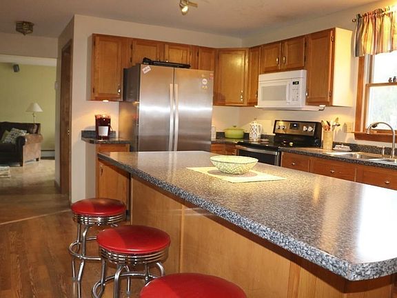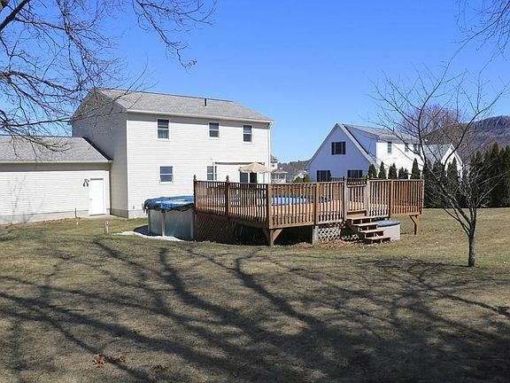 Situated on a quiet cul-de-sac minutes from Easthampton's vibrant downtown and all major routes, this four-bedroom colonial offers spacious living areas, roomy bedrooms, and great outdoor living. The upgraded kitchen features new stainless steel appliances (2017), an expansive island with plenty of seating and storage, plus counter space and cabinets galore. Sliders in the living room open onto a large deck with a retractable Sun Setter awning -- a great place to linger with family and friends. Take in views of Mount Tom from the deck of the well-maintained above-ground pool (new lining 2014, new pump 2017) -- perfect for family splash time and cooling off. Tons of closets, ample storage, hardwood floors throughout, freshly-painted rooms, and a high-ceilinged basement ready for finishing -- a great house in an excellent location!