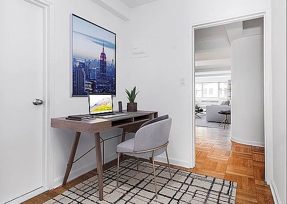 NO FLEXING ALLOWED LEASE START DATE July 25, 2023 Huge gut-renovated one-bedroom apartment with high beamed ceilings, hardwood floors, partial views of Gramercy Park, and South, East, and West exposures The extra large living is a great space for entertaining and blends well with the open custom-designed kitchen with a breakfast bar. The kitchen has a stovetop/oven, dishwasher, and a full fridge. The quiet and bright bedroom faces East and South into the courtyard and has a wall of 3 large closets in addition to the large coat closet next to the entrance. There is a home office just outside the bedroom and a large closet The newly renovated windowed bathroom is just outside the bedroom. The apartment has 5 large closets. PET FRIENDLY. Park Gramercy is a full-service condop located near the trendy restaurants of Park Avenue South, Union Square, and all major subway lines. The building has a full-time doorman, a beautiful roof deck, bicycle storage, and central laundry in the basement.