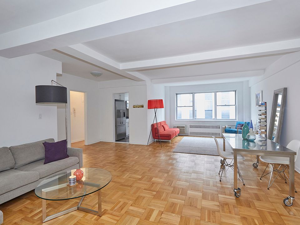 Spacious and light-filled apartment in a prime Gramercy location! This one-bedroom corner unit features North and West exposures, allowing for fantastic light and views of many of Gramercy's landmark buildings. Loft-like in size, the apartment has been tastefully finished and is complete with hardwood flooring and lovely beamed ceilings. The windowed kitchen was recently renovated and is complete with high-end appliances, including a Fisher & Paykel refrigerator and a GE stove, microwave and dishwasher. The generous proportion of the home makes it great for entertaining, with a separate dining area that easily fits an eight-seat dining table. The serene master bedroom offers both northern and western exposures as well as two closets, including one walk-in. The home is made complete by a windowed bathroom and an abundance of additional storage space. Park Gramercy is a full-service Condop less than a block from Gramercy Park and directly across from the Gramercy Park Hotel. The approval process is like a condominium (waiver of right of first refusal) with no board interview. This building has no set limits on sublets and being as it is that this unit is purely for investment purposes, multiple-year leases are allowed and encouraged. The building has a full-time doorman, a beautiful planted roof deck, bicycle storage, new central laundry facilities and is pet friendly.