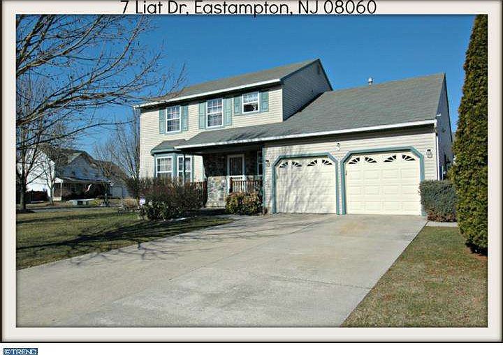Beautiful Aspen Model in the lovely Eastampton Meadows community situated on a corner lot. The back yard is completely fenced in. This 3 bedroom, 2.5 bath Colonial has hardwoods throughout most of the 1st level. Entrance hallway leads to a formal living room/formal dining room and a 1/2 bath for guest. The eat in kitchen has corian counter tops, tiled back splash, and oak cabinets. Off the back of the kitchen glass sliders open up to large concrete patio to the private fenced in back yard. Large family room complete with stone surround gas fireplace. The garage entrance through 1st level laundry. The second floor has a large master bedroom complete with walk in closet, large master bath. The second full hall bathroom has double sink and shower/tub combo. The second floor has two additional bedrooms. There are ceiling fans throughout the home. The unfinished basement has outdoor entrance to the back yard. Ready for finishing! The homeowners have added a security system and a central vacuum system complete with kitchen dust pan. The underground sprinkler system and the outside water outlets are on a separate meter.
