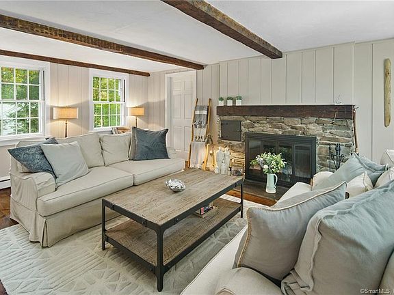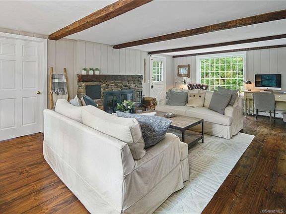Beautiful Rowayton Cape on quiet side street, brimming with charm, period details, great yard and move in ready. As you enter the front door you sense the warmth of this home. Inviting living room with beamed ceiling, wood burning fireplace, beautiful hardwood floors and views to raised patio and private back yard. Dining room flows to the kitchen and family room also with wood burning fireplace. Main level primary suite opens to the patio and offers huge bath with double sinks, shower, soaking tub, and two walk in closets. Two bedrooms and full bath on second floor with window seat, many closets and storage space. Lower level can be a playroom or home gym in heated space. There is a workroom and attached one car garage in addition to a two car detached garage with pull down loft above. Permanent generator. Walk to town and train within minutes. Enjoy all Rowayton has to offer with beach, waterfront village, library, tennis, paddle tennis, pickle ball, dog park, nature preserve and so much more.