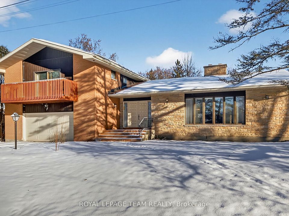 Stop the car! Fabulous opportunity to make this mid-century modern style home your dream home in a highly sought after neighbourhood of Honey Gables! Great bones to work with, over 2500 sq ft ... huge inviting entrance, vaulted ceilings in massive living room, sunken eat-in kitchen and dining room plus den with a dramatic 2 sided wood burning stone fireplace ... huge windows for fantastic natural light. Main floor office, powder room and laundry finish this level. A california style staircase takes you to the upper level. 3 bedrooms, a bonus sun room off one of the bedrooms and a balcony off the primary bedroom overlooking the street. Parking is not an issue with a 2 car garage and 4 more spaces. Massive yard for the family completes this picture. Walk a half block to Honey Gables Park sitting along the Rideau River. Note: Hydro panels on roof, infrastructure on exterior garage wall.