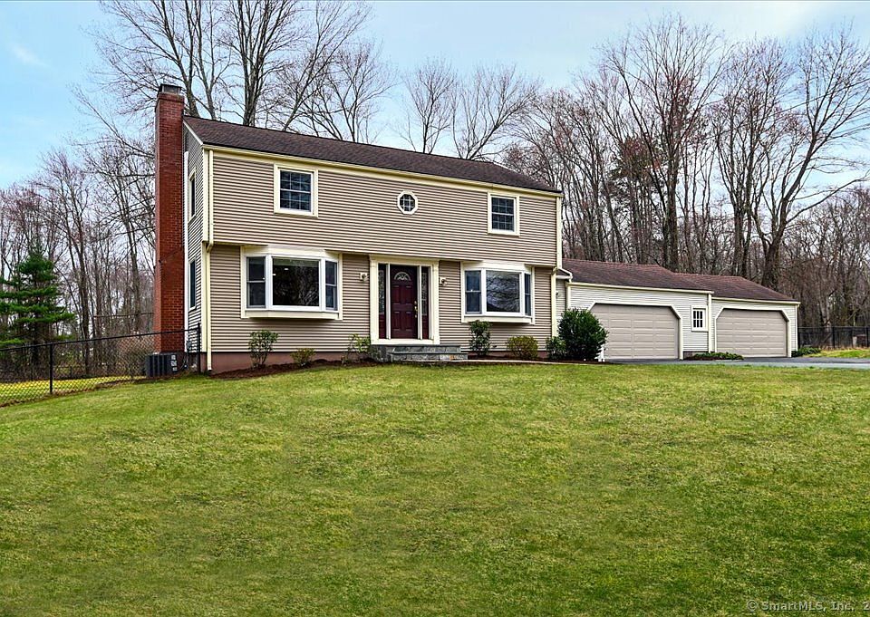 Move-in condition colonial in a great central Simsbury neighborhood! Fresh paint inside and low maintenance vinyl siding outside. All 4 bedrooms upstairs including large primary bedroom with private bath, office area, & large slider windows overlooking nature. Remodeled kitchen with large island is open to the dining room & 1st floor office. Sunlit front to back living room with fireplace and bay windows. Delightful finished basement has both natural light & walk-out to backyard. Immerse yourself in the 3 season sunroom overlooking picturesque flat, fully-fenced backyard and a large rear patio perfect for grilling out. Enormous 4 Car Garage perfect for workshop, car collector, or storage. Wired for back up generator.