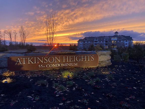 You deserve the carefree lifestyle of the highly anticipated Atkinson Heights 55+ community. Choose your colors and finishes for this 'Kinsmen' penthouse with over 1800 sq ft of luxury. This unit has 2 BR, 2 BA, separate laundry room, open concept kitchen/living and dining area, and office space. You may feel guilty not cooking in your gourmet kitchen! Loads of cabinets, s/s hood and gas cooktop, 8' island, large pantry closet, wall oven/microwave, soft-close cabinets, under-cabinet lighting, and s/s appliances are all standard features. The dining/living room has vaulted ceilings, recessed lighting, engineered wood floors, inviting gas fireplace, ceiling fan and 12 feet of windows with a double slider so you can enjoy the expansive views of the 17th fairway of the Atkinson Resort & Country Club and breathtaking sunsets from any seat or your 15 x 9 deck. Barn-style door opens to an office off the dining area. The primary suite has large walk-in closet, and standard is the spacious fully tiled shower with bench to relax, a double vanity with quartz countertops, and a water-closet w/ pocket-door for privacy. Each unit has one assigned garage space with storage, and one assigned outside parking space. The community center (to be built) will be a perfect gathering space. Walking paths, dog park, community garden, dog washing station, and proximity to all area amenities and major highways make this a perfect place to call home. Pictures shown are of similar unit w/ upgrades.