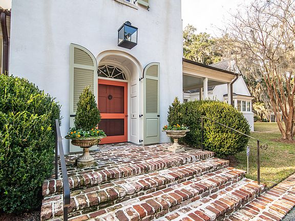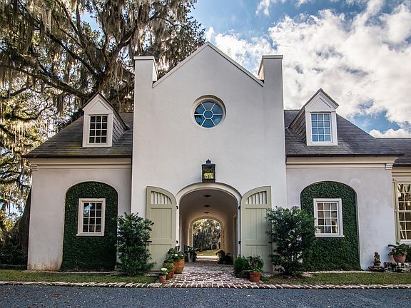 Perched 25 ft above the Intracoastal Waterway, this Barbados-influenced home is designed so that every room has at least three light changes throughout the day. Making great use of salvaged bricks, it is constructed on the footprint of the original house that stood on this site until the 1800s, and with four bedrooms and four and one half baths, the residence offers plenty of living space. Ideal for entertaining, the superb layout benefits from a stunning kitchen and dining area, plus multiple French doors that open to a riverside porch and terraced lawn. Custom lighting and paint colors are used throughout --the principal gathering room is characterized by a hunting lodge aesthetic, perfect for more intimate or group gatherings. The estate feels connected to the land, with ground level terraces and sensational views taking in pastures on one side and a river on the other, as well as historical rice fields and private boat dock. Spacious guest quarters over the carriage house garage and a separate artist's studio complete this idyllic scene ~ 7 Lower Waverly. This property is under a Conservation Easement which includes: 59 Acres [approx. 44.681 Acres Highland / 2 Acres Pond / 12 Acres Wetland located in River/Former Ricefields]