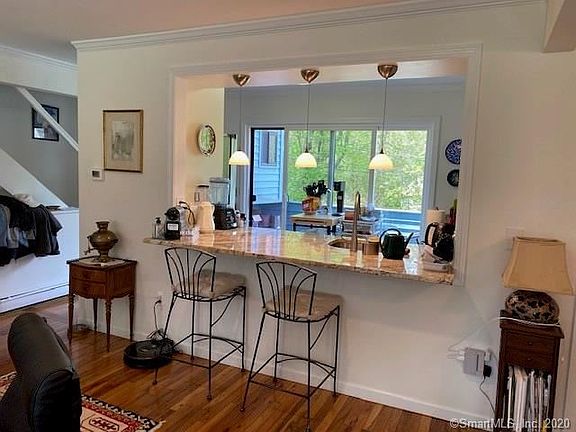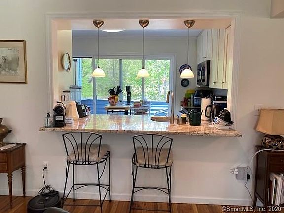 Welcome home! Light and bright, beautifully remodeled two bedroom, one and a half bath townhouse with an amazing outdoor living space. Gorgeous eat in kitchen, featuring new cabinets, granite countertops and new stainless steel appliances. Gleaming hardwood floors throughout. Large windows in the living room a grand fireplace warm up the space. Additional living space added with a new four seasons room owners had built. Updated bathrooms with high end fixtures and granite counter tops. One car garage with extra storage space and a small finished office in the basement area. Quiet community, close distance to charming downtown Bethel. Great commuting location. Enjoy the Summer on your new outdoor patio overlooking a lush private lawn. Must see!