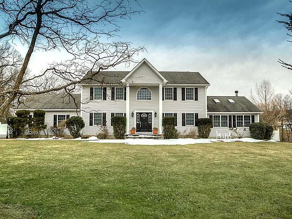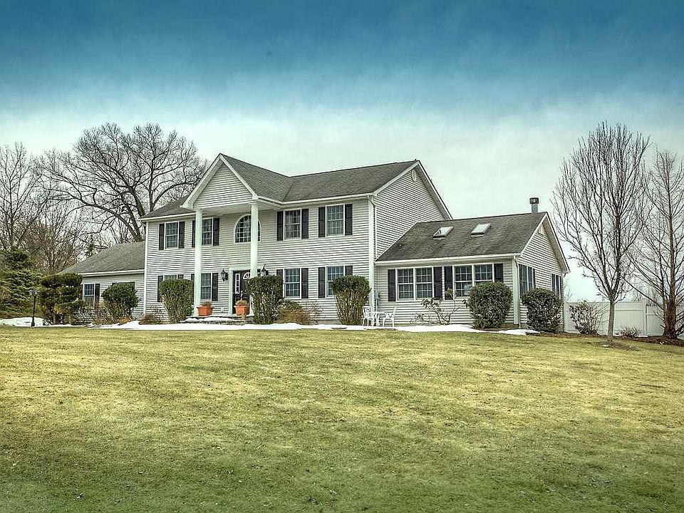 Situated at the end of a quiet cul-de-sac on 9 acres of pretty rolling land, this spacious and elegant Colonial invites family and friends to enjoy its open, easy-flowing floor plan. A spectacular great room surrounded by floor-to-ceiling windows, skylights and a wood-burning fireplace, offers a wonderful gathering place in any season, with doors leading to an oversized deck for summer dining or a dip in the pool. The completely renovated chef's kitchen has professional grade appliances, a center island with prep sink and seating for four - a breeze to work in. The flow is uninterrupted from the kitchen to the breakfast room, into a charming and unique reading or conversation center - it's a perfect home for entertaining. All three full bathrooms have been stylishly renovated and the master bedroom elegantly floored in ebony-tinted wood. The bedrooms are well-proportioned with excellent closet space and the partially-finished basement offers an additional 736 sq. ft. of finished living space and even more storage. The land is equally attractive, a peaceful and serene setting for this stunning home with a natural stream-fed stocked pond. A pair of swans visit every other year adding to the beauty of it all. Come take a look around!