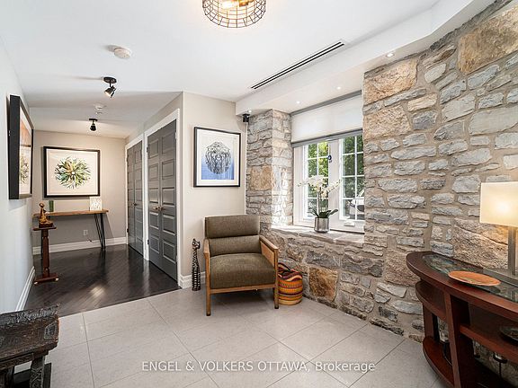 Welcome to this one-of-a-kind condo in the Victoria Woolen Mill in the heart of Almonte's historic district. With over $50K of improvements added in 2024-25, the unit's spacious foyer is filled with charm, featuring a stone accent wall, deep window ledges, and ceramic tile that flows seamlessly into elegant hardwood flooring carried throughout the home. Floor-to-ceiling windows and two large private balconies capture the home's most remarkable feature - a stunning and almost surreal view of the Mississippi Rivers Grand Falls. The showpiece kitchen is designed by Montreal luxury brand Miralis, and features quartz countertops, a striking island with a designer hood fan, a premium brand fridge and five-burner induction range, and sleek German hardware with pull-out storage solutions. The top-of-the-line Bosch dishwasher blends seamlessly into the custom cabinetry, while open shelving, a vibrant backsplash, and bright pot lighting combine style and functionality. The living and dining areas flow effortlessly together, with custom millwork offering both display shelving and abundant storage. High ceilings and recessed lighting enhance the open, airy ambiance. A thoughtfully designed pantry houses premium Electrolux laundry machines, additional cabinetry, a folding counter, and even a Fisher & Paykel dishwasher drawer. A full bathroom with shower and vanity, along with an adjoining storage room, completes this functional wing. The primary suite features double closets, unique architectural curves, and a beautifully renovated ensuite - complete with slate tile, heated floors, a rain shower, and a Canadian-made double vanity. The second bedroom, currently used as an office, offers privacy with a pocket door and flexible use as a guest space. With its rare combination of historic charm, modern luxury, and close proximity to award-winning businesses such as Hummingbird Chocolate Factory and Vodkow-Dairy Distillery, this residence is more than a home - it's a lifestyle.