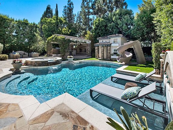 Situated in the prestigious Arbor Crest Estates neighborhood of Irvine's Northwood Community, this exquisite home features a 24-hour gated entrance. Entertainer's dream home for the whole family. Gorgeous Walker Zanger Travertine floors welcome you as you enter the home. Enjoy formal living by the warmth of the fireplace, including a formal dining room, and large family room with custom built-in home entertainment system. A custom panoramic window wall of stacking doors in the family room creates a seamless indoor-outdoor flow. Outside in the private entertainer's backyard you will find a luxurious custom pool with Ozone system, spa with waterfall, slide, and built-in Thermador BBQ with smoker. A custom ledger stone fireplace is the focal point of the outdoor room, and the backyard is also equipped with a children's playhouse that is a replica of the main house. Inside, the gourmet kitchen begins with a pass-through the Bulter's pantry and is outfitted with Thermador Professional appliances, Bosch dishwasher, Sub-Zero refrigerator/freezer, granite counters, walk-in pantry and large island with eat-in kitchen. The main level bedroom is currently an office with en-suite bathroom. The upper level features 4 bedrooms, each with own full bathroom. Master suite with gas fireplace, walk-in closet, luxurious bathroom. A spacious multi-use loft with custom built-ins, 4 car garage, with custom cabinets/workbench. Award winning schools of Irvine.