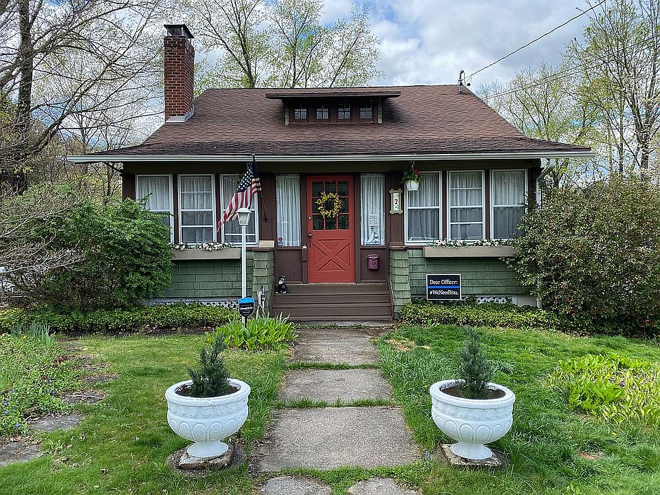 Nestled in over a third of an acre of roses, rose of Sharon and dogwood trees, this charming arts and crafts bungalow has it all: hardwood floors, large living room, handsome woodwork, oversized two car garage with workspace, and potential to subdivide. Enjoy gorgeous mountain-view from your large three-season porch. Complete the partially finished second floor for a four bedroom house, or simply enjoy one floor living. Easy walk to bakery, library, theatre and restaurants, yet on a quiet street near the edge of town. Raise a family or retire with ease. Live worry free with new top of the line Rheem furnace installed in 07, Architectural shingle roof 09, new Fireplace liner and stove in 10, upgraded Electric 08, kitchen renovation 2012 and bathroom renovation 2011. (Owners own & willing to leave sheet rock and insulation to finish second floor.)