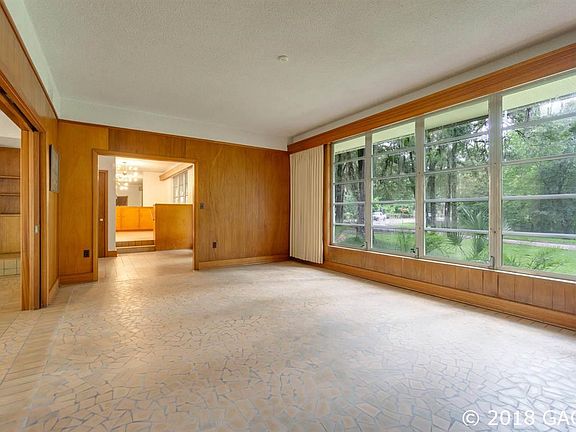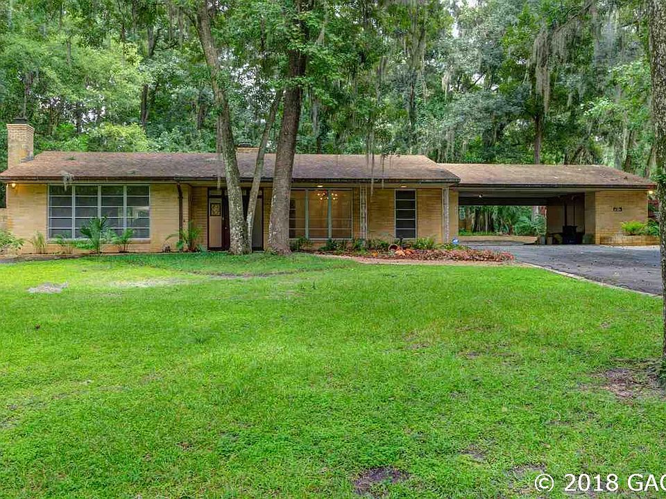 Charming mid-century home located in the heart of Gainesville. Just a 10 minute walk to the stadium! The home features spacious living areas, dining room w/ built-in bar, formal living room, two fireplaces (1 gas & 1 wood burning), laundry room w/ exterior access, and ADT security system. Mahogany trim and quarry tile throughout. Large kitchen w/ island, two sinks, and plenty of storage. Sliding glass doors off of the family room allow for plenty of natural light. Back patio is perfect for entertaining. Conveniently located near campus, downtown, & shopping!