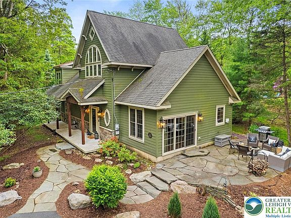 Luxury meets lodge living in this breathtaking Split Rock custom cottage—perfectly positioned on a wooded corner lot in the heart of Lake Harmony. From the moment you arrive, curated hardscaping, designer landscaping, and a charming covered porch set an elevated tone. Step inside to soaring cathedral ceilings, a dramatic floor-to-ceiling stone fireplace, and expansive windows that flood the space with natural light. The open-concept design is ideal for entertaining, with hardwood floors, recessed lighting, and seamless flow throughout. The chef’s kitchen stuns with granite counters, stainless steel appliances, custom tile, and a tiered breakfast bar. The main-level primary suite offers an en-suite bath, walk-in closet, and bonus nursery space. Upstairs, a bright loft overlooks the living room, flanked by two spacious bedrooms and a sleek hall bath. One bedroom features private balcony access to a multi-tiered composite deck—your ultimate outdoor entertaining space. An attached garage, two driveways, and every upgrade imaginable complete the package. Whether a luxe getaway, full-time escape, or high-end rental, this showpiece delivers mountain lake living at its finest—just minutes from all Lake Harmony has to offer.