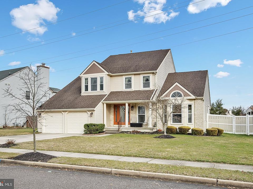 ***The sellers have received Multiple Offers and are requesting Highest and Best due by Tuesday 10/17 at 12pm*** This stunning Medford Model home will captivate you from the moment you arrive. A charming covered porch adorned with classic columns and a brick facade sets the tone as you approach the custom leaded glass front door, infusing the foyer with natural light. Step inside, and you'll find a beautifully designed space with a neutral gray and white ceramic tile floor. The dramatic living room boasts vaulted ceilings, highlighted by a Palladium window and recessed lighting, creating an inviting and bright gathering space. Neutral carpeting graces the living room and flows seamlessly into the adjoining dining room. The home's architecture is both unique and captivating, featuring varying ceiling heights that add to its allure. The formal dining room boasts a vaulted ceiling and connects seamlessly to the living room. Large windows and a slider flood the space with natural light and offer a picturesque view of the covered patio and private fenced yard. The heart of this home is the incredible gourmet kitchen, adorned with glazed Hickory cabinets, granite countertops, and an eye-catching glass backsplash. The center island houses a GE Profile glass cooktop, complemented by double ovens, a French-style refrigerator, and an LG dishwasher. Recessed lighting illuminates the ceramic floors, while a gas fireplace graces the breakfast area. A charming bump-out in the breakfast room provides delightful views of the deck and backyard. For those who value an open kitchen-family room layout, this home delivers precisely that. The family room is generously sized and features a French door with custom leaded glass accents. Neutral carpeting and tastefully painted gray walls complete the cozy ambiance. Conveniently located off the family room, the laundry room adds to the home's functionality. The powder room features a pedestal sink and ceramic flooring, adding an elegant touch. Ascend the dramatic turned staircase, which overlooks the dining and living areas, and you'll find an expansive master suite. Neutral carpeting and paint create a versatile canvas for your personal style. The primary bath boasts double square sinks set in black cabinets with granite countertops, a Jacuzzi tub with a charming window above, and an oversized stall shower with gray ceramic walls. A walk-in closet provides ample storage for the fashion enthusiast. Currently, the fourth bedroom has been converted into another suite, offering a nicely sized bedroom with a sitting area. The option to revert to a four-bedroom layout remains easily accessible. The other bedroom is also generously sized and offers serene backyard views. The main bath features gray tile floors and a tub surround, along with gray cabinets and double sinks. The private backyard is a delightful oasis, enclosed by a two-tone vinyl fence. The level yard is perfect for outdoor activities, while the deck overlooks the expansive lot, has a newer retractable awning and ideal for outdoor barbecues and entertaining. This home is move-in ready and includes solar panels on the back to offset your energy costs. Its ideal location is conveniently close to major roads, shopping, and offers an easy commute to Philadelphia. The home is in good condition, however the sellers would like to sell AS IS. The seller will provide the township CO.