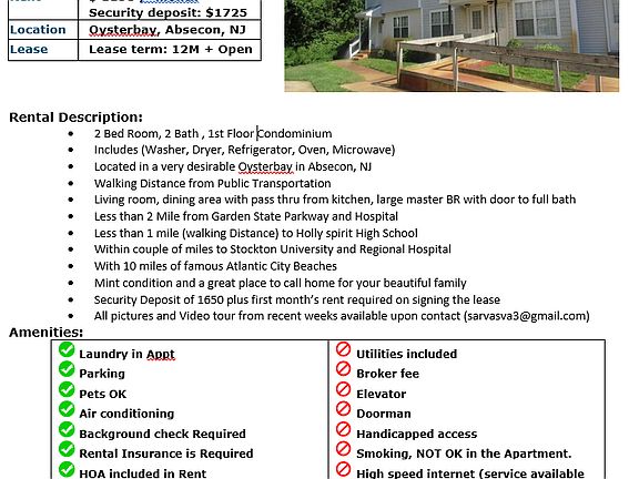 2 Bed Room, 2 Bath , 1st Floor Condominium ;; Includes (Washer, Dryer, Refrigerator, Oven, Microwave) ;; Located in a very desirable Oysterbay in Absecon, NJ ;; Walking Distance from Public Transportation ;; Living room, dining area with pass thru from kitchen, large master BR with door to full bath ;; Less than 2 Mile from Garden State Parkway and Hospital ;; Less than 1 mile (walking Distance) to Holly spirit High School ;; Within couple of miles to Stockton University and Regional Hospital ;; With 10 miles of famous Atlantic City Beaches ;; Mint condition and a great place to call home for your beautiful family ;; Security Deposit of 1725 plus first month?s rent required on signing the lease ;; All pictures and Video tour from recent weeks available upon request