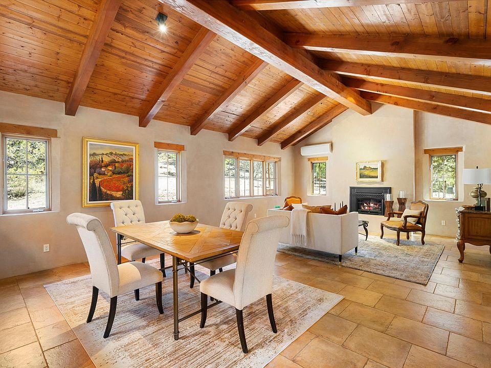 Nestled on 2.5 acres in the NW hills of Santa Fe and enveloped by a variety of mature trees this quintessential home boasts tongue and groove wood beam ceilings, plaster walls, and radiant heat throughout. Upon entering you're greeted by natural light and an inviting open concept floor plan. The magnificent island in the carefully curated kitchen is the focal point and gathering area. French doors throughout the home lead out to the covered courtyard and fireplace which is ideal for entertaining. The primary suite offers a seating area, wood burning fireplace, jacuzzi tub and walk-in closet. Privately tucked away but only minutes from shopping, schools, restaurants and the Santa Fe Plaza, this home is perfect for those seeking privacy and tranquility without sacrificing convenience.