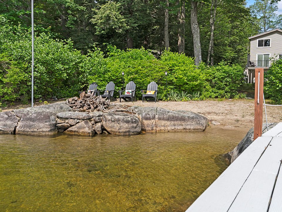 The highlight of the shoreline is a stunning natural rock with a built-in fire pit—carved right into the stone—creating a one-of-a-kind spot to gather and take in breathtaking Lake views.
