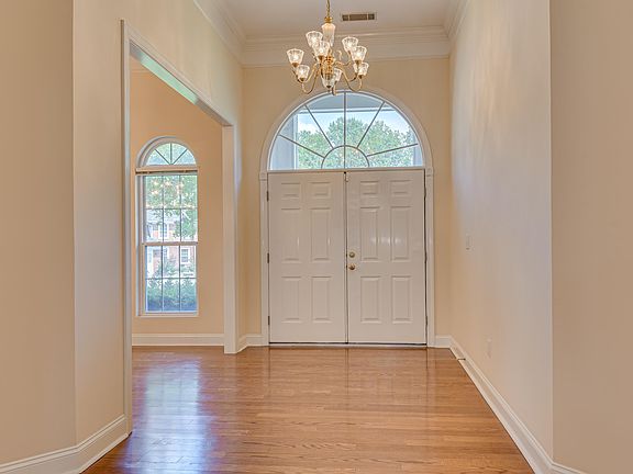 Step inside through the grand entrance, graced by double solid wood doors that reveal an elegant interior adorned with intricate trim and crown molding, arched openings and transoms, and the gleaming hardwood floors stretch seamlessly through the open foyer, the formal dining room with its timeless charm, and the spacious great room where a gas fireplace takes center stage, flanked by meticulously crafted built-ins.