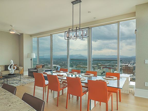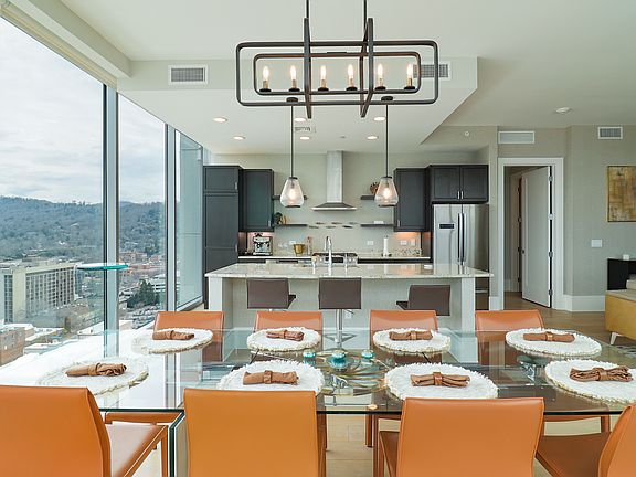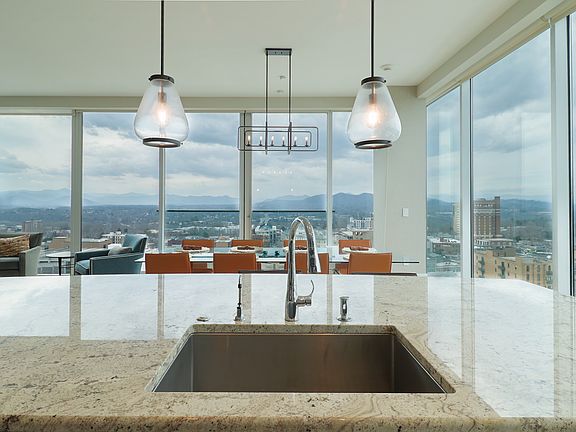 Enjoy living in the heart of downtown Asheville! This fully furnished modern luxury condominium features stunning mountain views through expansive 10' floor-to-ceiling glass windows and sliding doors, filling the space with natural light and offering a seamless connection to the outdoors. The open-concept design, paired with sleek, contemporary finishes, creates a refined and welcoming ambiance. This 3 bedroom 2 1/2 bathroom condominium offers comfort, convenience and the an opportunity to live among the clouds. Enjoy an array of amenities, including an on-site restaurant and bar, a fully-equipped fitness center and spa, and an assigned parking space in the attached garage. A climate-controlled storage unit is also included. Take advantage of this exceptional opportunity to indulge in luxurious downtown living. An application is required for all showings, preferably through Zillow. Please note that a minimum 24-hour notice is required for showings. Owner responsible for utilities. HOA fees are included in the rent. Minimum 1 year lease agreement. Non smoking unit.