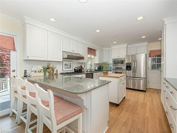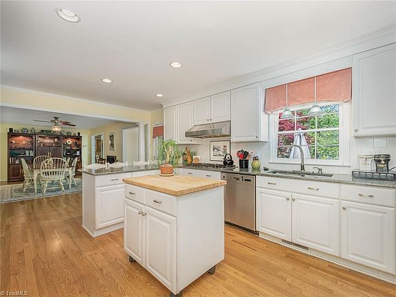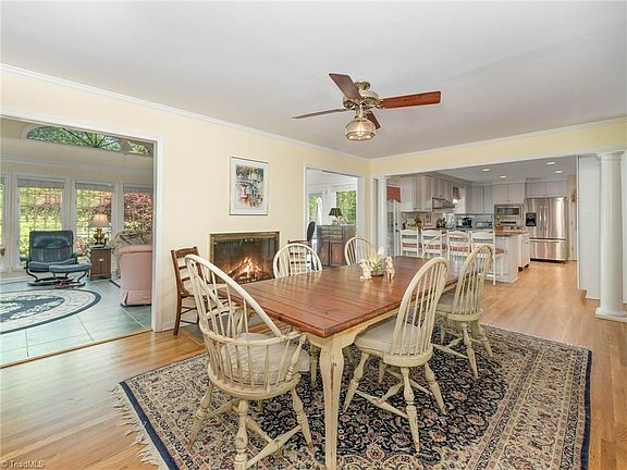 Opportunity awaits in this exquisite home w/updated kitchen & 2 of 3 full baths totally renovated! So much is already tastefully done in this home. Kitchen has wood floors, granite, SS appliances, small island, breakfast bar w/seating. Large laundry room w/lots of storage. Huge dining area open to kitchen, then open to marvelous sunroom on rear of house, overlooking woods. Front of house has great room connected to flex room (sitting room or office w/a view?). Lots of pretty molding. 5 bedrooms, 3 down & 2 up. Very spacious primary BR on main w/large walk-in closet & ensuite BA. Outdoor front of home is parklike setting, beautifully landscaped. 3 car oversized side load garage w/tons of cabinets and counters & heated and cooled. On rear, updated deck w/amazing views of woods. Stamped concrete patio below. Lots of room for outdoor living! Below sunroom is room w/HVAC & secondary kitchen area set up for entertaining. This is the one for you!