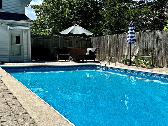 Amenities include oil heat, an on-site washer/dryer, a 2-car garage, an in-ground swimming pool, and window AC units.
