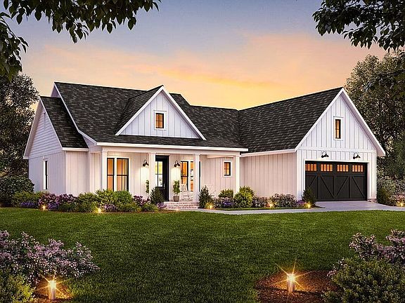 A large decorative gable sits above the 6'4"-deep front porch of this attractive 3 bed, 2 bath and an office 1,843 square foot contemporary farmhouse plan. A front-facing 2-car garage - has a decorative window above The center of the home is open concept with the great room with fireplace in front separated from the kitchen and dining area by a beam in the ceiling. A door on the back wall gives you access to a 260 square foot covered porch extending your livability to the outdoors. The master suite is alone on the right side of the home and has direct access to the laundry room from the master closet. Across the home, three bedrooms share a bath and all have walk-in closets. Renderings are likeness only of the plan for the home. We are happy to discuss options and modifications. Lot 5, 1 acre turn key home is for listing price. Pictures and renderings are likeness only.