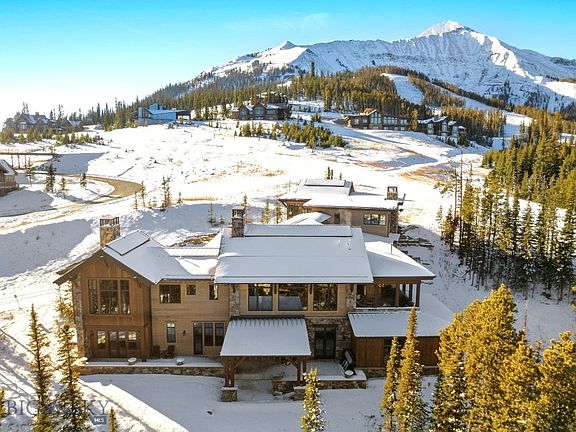 This majestic Moonlight Basin residence in the coveted High Camp neighborhood, checks all the boxes, with elegant finishes, stunning panoramic views, thoughtful entertaining and sleeping spaces, unbeatable ski access, all in an unparalleled location in Montana’s most desirable ski area. Offering 6 bedrooms and 8 bathrooms, this oasis sleeps 20 comfortably on three levels, luxuriously accommodating large groups or intimate gatherings. The stone entry boasts the first glimpses of the formidable stone accents featured throughout the home, with the grand hall revealing a vast timber-framed ceiling with forged iron accents and a floor-to-ceiling fireplace with a 3,500-pound hearthstone. The commanding views from much of the residence are truly magnificent; wide open Spanish Peaks and Lone Mountain views are everywhere. Giant sliding doors off the dining area access the adjacent covered porch, with motorized screens, comfortable seating and more stellar views. The kitchen has custom cabinetry and lighting, walk-in pantry, an inviting breakfast nook and an ample bar. The ascending and descending stairwells from the grand hall are set against a wall of windows that provide profuse natural lighting, reaching from the heart of the home to the lower level. Walnut wrapped stair treads feature inlaid travertine and custom iron railings fortify the stairs with hand hammered artistry. The main level primary suite feels a world away from the hub of the home, with its cathedral ceiling, fireplace, sitting area, bath and walk-in closet. A wall of custom steel artistry is the signature item of the lower level, depicting Lone Mountain at night, which impressively divides the lower-level hallway from the media room; wooden barn doors on a 36-foot track slide together to offer privacy. The media room and all 3 guest suites have access to the exterior stone patio, yet more views, and glimpses of the abundant resident wildlife. On the main level, ascend the floating stairs and traverse to the home’s guest quarters and ski lounge, with direct access to the groomed Natawista and Cinnabar ski runs. The guest area also has a private entrance, kitchen, living area, fireplace, wall bed and full bath. The lounge has plenty of lockers and cubbies just inside the ski-in entrance, complete with boot and glove dryers and ski racks. Call to arrange a private showing of this spectacular, one-of-a-kind, slope side offering in one of the most desirable natural environments in the West!