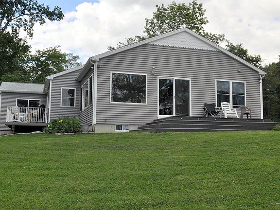 Custom designed Lakefront Home! Every detail thoughtfully created with attention to functionality and quality. You'll need to see and feel the home's warm and inviting open floor plan to appreciate its value. 265' of waterfront. The elegant front door leads into the hardwood maple floors that span the first-floor w/polished porcelain tile in the baths. Views of the Lake from every room on the main floor is a feast for the eyes over the green lawn to the blue water & hills beyond. The custom kitchen w/rich white/grey Quartz countertops, gorgeous tiled backsplash and custom maple cabinetry. A center island with cooktop adds space and ability to enjoy the view. Attractive and ample lighting from recessed LED to charming hanging Ferguson fixtures. Two bedrooms round out the first floor. Enjoy the overhead dual HVAC system that supplies forced hot air or cool AC! Downstairs has comfy radiant heated tile floors, an additional BR & bath along with four other rooms. Quick easy access to town.