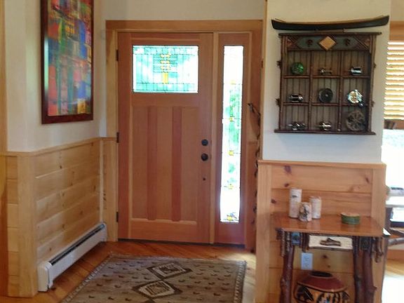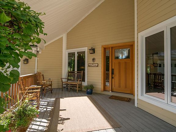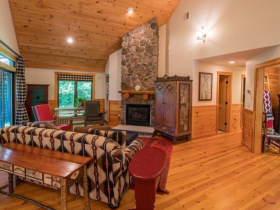 Owls Nest Golf - Campton NH Real Estate This house has it all! A private driveway leads to 7 Southwest Spur with its’ large covered front porch. This custom furnished, one floor, centrally air-conditioned home overlooks the 2nd hole of the Owl's Nest Golf Course. Winter skiing is only 10 minutes away in Waterville Valley. Settled on 1.04 private acres, this home will become the year-round vacation spot of your dreams. Incredible attention to detail can be seen throughout this property. The wide pine floors greet you as you enter the great room that includes the kitchen, living room, dining room and den/office. Look up and you will see the pine clad, cathedral beamed ceilings with recessed lighting. New gleaming granite counter tops and angled new tiled floors surround the latest stainless appliances. In the laundry room off the garage, you will notice fresh paint, a new w/d, new tiled floors, and a new boiler and hot water tank (2017) as well. The living room windows let in plenty of natural light which help expose the “ceiling to floor” gas-fired, stone fireplace. The 1st floor master bedroom has its own private bath with a glass shower and vanity. There is 1 more bedroom and bathroom with shower on the first floor for guests. Upstairs, there is a huge bunk room above the garage. As for storage, there are 9 different sized closets in this house. The dining room sliding doors lead to the backyard deck with an outdoor remote awning and Adirondack furniture.