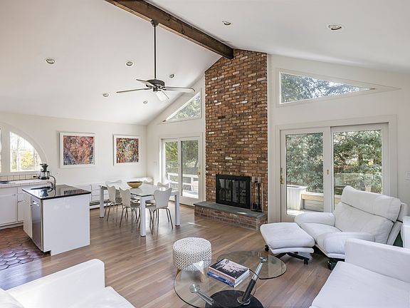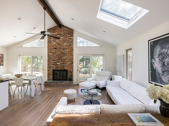 Escape to this stylish, light-filled 2-bedroom, 3-bathroom home, ideally located just 1,000 feet from Sammy's Beach-East Hampton's best-kept secret. Enjoy one of the Hamptons' most beautiful and swimmable bay beaches, complete with spectacular sunsets. Situated on just under half an acre, this 2,000-square-foot retreat offers a bright, airy living space designed for comfort and relaxation. The ensuite primary bedroom features a private sliding glass door that opens to a secluded deck, perfect for morning coffee or evening relaxation. The open-concept living area is bathed in natural light, with skylights and two sliding glass doors that lead to a spacious deck, ideal for summer dining and entertaining with a grill. The indoor dining table comfortably seats six and expands to host up to ten guests. A separate den with closing doors offers flexible use as a guest space, TV room, or quiet retreat. Upstairs, the second ensuite bedroom, with crisp twin beds, is perched among the treetops for a peaceful night's rest. Outside, enjoy an outdoor shower, a lush, fenced-in backyard filled with hydrangeas, and a generous lawn-perfect for soaking up the Hamptons summer. Centrally located to East Hampton and Sag Harbor Villages, this home offers convenient access to the best the East End has to offer.