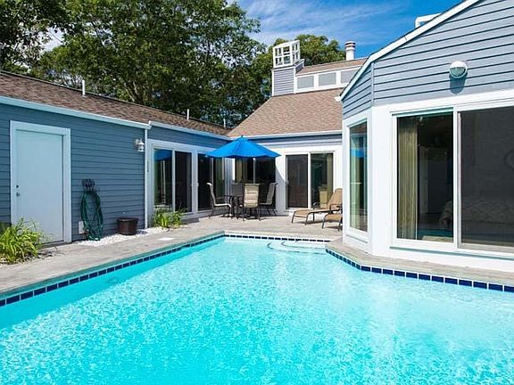 Situated on a private cul-de-sac in the Promontory Point village of New Seabury, this renovated 3 bedroom, 4 bath single floor unit has a newly retiled private pool and enclosed courtyard patio with a backyard area for grilling and relaxing. The kitchen has stainless steel appliances, granite countertops and new cabinetry. Light and bright with expansive windows, hardwood floors, and Andersen sliders that open onto the pool/courtyard area and the backyard. Hunter Douglas blinds, gas fireplace, and solar operated skylights are recent upgrades. New HVAC system on Master bedroom side of the house. Oversized garage with built-ins for extra storage. This home is the perfect summer getaway with South Cape Beach a short walk away. Completely move-in ready!
