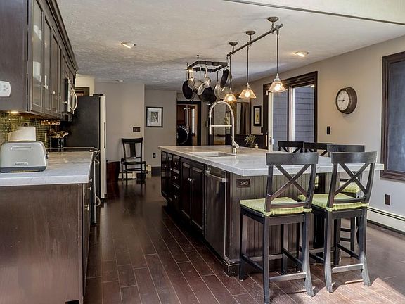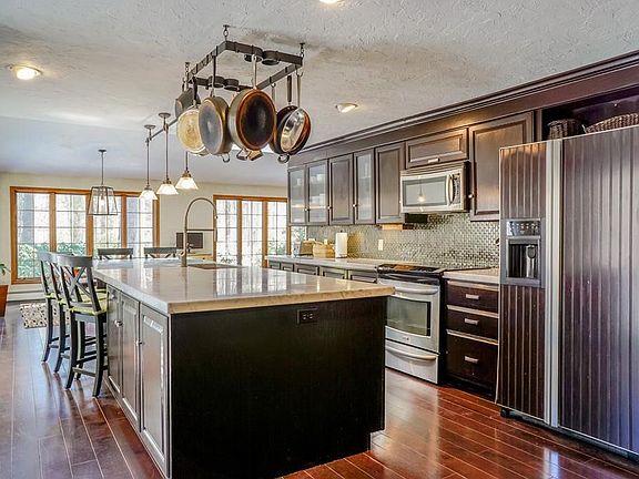 Expansive Tudor-style home. Hardwood flooring throughout chef's kitchen, dining room, and huge breakfast area. Kitchen features over-sized island, marble counter-tops, stainless steel appliances, and upgraded cabinets. Vaulted ceilings and stunning fireplace in living room. Large screened-in porch perfect for outdoor enjoyment. Beautiful Hearthstone wood stove insert in family room. Breakfast area behind kitchen surrounded by windows and skylights provided natural light and a view of the private backyard. A 14 x 14 octagon room is separated from master bedroom by pocket doors. Large finished basement with custom wine cellar, workshop and direct access to garage. Storage is plentiful. Home also features a large open foyer. First-floor laundry/mud room. Professional, mature landscaping with in-ground sprinkler system. Home is set-back from the cul-de-sac street and features wooded front yard with circular driveway. Home is very secluded yet close to town center.