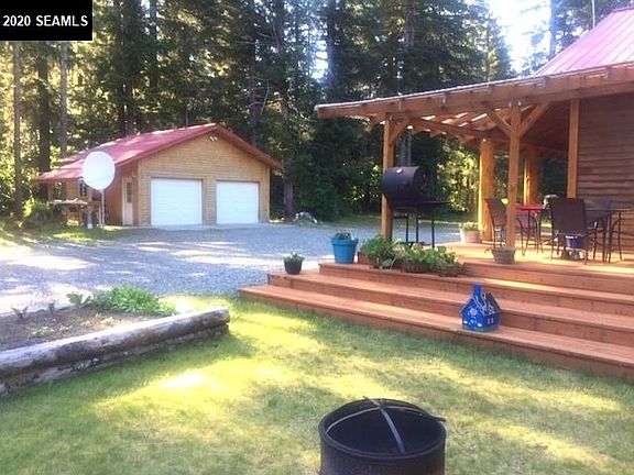 Beautiful hand-built home! Lumber logged & milled on-site. Custom, carved front door warmly welcomes you under the eyebrow of a long covered front porch. A covered deck steps into the private back yard with raised gardening beds & shed. Wander over to the wood-stove heated 2000sf shop that includes upstairs storage loft, 3 separate 10'x10' rooms & door out to wood storage that holds 5 cords, plus wide 10' overhangs to cover your boat. This is in addition to the detached 24'x24' 2-car garage with covered fish cleaning station that has electric, water & sink...and the fishing is fantastic! A blazing pellet stove along with the warm pine & drywall interior keeps you cozy year-round in the main home, along with the efficient comfort of an on-demand Toyo water heater. The mechanical room houses the pump pressure tank, reverse osmosis (RO) unit to provide very clear drinking water at kitchen sink and refrigerator, water softener, and individual valves controlling separate lines to water throughout the home. This rare 2-bedroom home offers an additional bonus room & other lovely details to enjoy in a peaceful sanctuary!