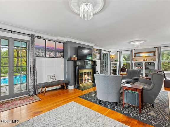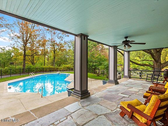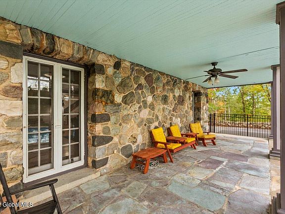 How grand! A combination of old world charm and modern luxuries blend to create this magical home. The 1911 stone house was designed by famous architect Marcus T. Reynolds credited with building Albanys' famous D&H railroad building at the bottom of State Street hill. The 4600+ square foot, 5 Bed/4 Bath mansion retains original fireplaces, chandeliers, spacious veranda, a stunning butlers pantry and four bedrooms have their own private balcony. The feeling is stately yet presents an undertone of warmth and gracious living. European styled gardens encased by original stone walls contribute to the overall elegance of the 17 acre property.The in-ground swimming pool and brick carriage house are just two value added bonuses.