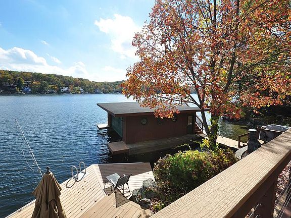 Dramatic open floor plan captures stunning lake views through wall of windows. Open floor plan concept, perfect for entertaining. Enclosed 3 season porch, boat house with boat lift. Expansive decking w/Jacuzzi. Top of the line whole house generator, 3 AC units, 5 zone heat systems. New kitchen cabinetry, stainless appliances finished w/granite counter tops & accent lighting. Custom built in pantry & wine cooler! Dining rm/liv rm w/fireplace, beautiful wood burning stove. family room all with vaulted ceiling, exposed beams, hardwood flooring & lake views. 3 bedrooms, full hall bath, half bath & master suite w/new full private bath, walk-in closet & private deck. Also 2nd floor 30 x 32 bonus rm 2 level w/private deck & lk views. Outdoor living begins w/three season porch. Composite decking, docks, sandy beach & swim. Private boat ramp for removal and launching. Resort living 1 hr to NYC. 25 min to ski/golf,spa.Take your boat to beautiful restaurants on the lake.