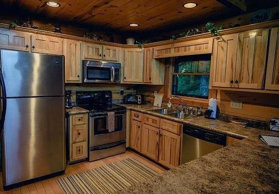 The Bears Den is a spectacular luxury cabin beautifully decorated in rustic decor yet modern in amenities and offers all you could wish for. From the moment you wake up the breathtaking mountains are in full view year round from all 3 levels of the home. The main level host large great room with open cathedral ceiling, a family room with plasma tv w/satellite & dvd player, leather sofas & gas stone fireplace. The dining area seats 6 w/additional seating at the breakfast bar for 2 more. The kitchen is fully equipped & with stainless steel appliances. The Bears Den is a 3 bedroom 3 bath with 1 king & 2 queen with all the comforts of home. The Game Room is furnished with 2 full size futons and can accommodate sleeping 2 additional guest. Each level has own bedroom & bath for the comfort & privacy for all. The upper level consist of master bedroom with king log bed, cedar dressers, flat screen tv w/satellite & dvd player. Full bath and a large walk in closet. Imagine the first thing you see as you sit up in bed is the beautiful sunrise overlooking the long range mountain views! On the main level you will find the second guest bedroom with queen log bed, satellite tv w/built in vcr, full bath w/double vanity sink. In addition to the main level there a washer & dryer if you choose to use them. The lower level of the home host third guest bedroom w/queen bed & full bath. You will find a rec room with pool table, we bar, poker table , plasma tv & more beautiful mountain views!