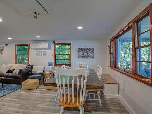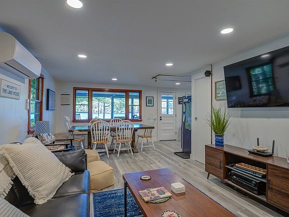 Welcome to this charming 3-bedroom, 1-bathroom property located on the northeast shore of Frye Island, offering stunning views of Frye's Leap. Situated conveniently next to the Ferry terminal, this home boasts 83 feet of sandy frontage and a very level lot, all on one level. The large, screened porch provides a perfect spot to enjoy the beautiful views of Sebago Lake. This property features an open floor plan with a large window in the dining area offering water views. It includes air conditioning, a floating raft, a canoe, a peddle boat, a stand-up paddle board, and a washer/dryer. The bathroom has been updated for your comfort. Parking is available for a maximum of 2 cars. Linens and towels are not provided but are available to rent at our office. Located on Frye Island, this home is conveniently positioned next to the Ferry terminal, making it easy to access. The island offers a serene environment with beautiful lake views and opportunities for water activities. The ferry is cash only. Smoking is not allowed on the property. The water source is well water. There is no dock suitable for tie-up, but a mooring is available. The property does not provide cable TV, but internet access is available. The grill type is gas and a fire pit is available for use.