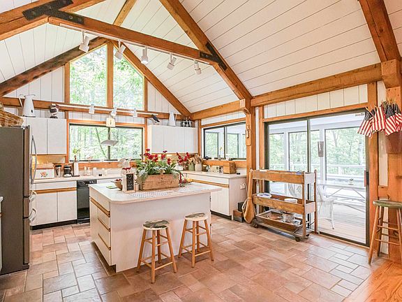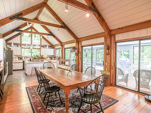 Waterfront at Eastman!! Stunning contemporary home with 4 Bedrooms and 3.5 Bathrooms in Eastman! With floor-to-ceiling windows, a 2-story double sided stone fireplace and a gorgeous view of the lake, this post and beam home will instantly captivate you. With 3 levels of living space, it boasts a 1st floor primary suite, a hot tub on the deck, an expansive 3-season porch, a lower level walkout, guest quarters, a steam room and large bathrooms throughout. Plenty of space to entertain as well as relax and unwind with family and friends. Nestled back from the road with wooded privacy, this is an ideal location for a vacation home or primary residence. The four-season community of Eastman offers lake activities, championship golf, groomed cross-country ski trails, walking trails, tennis, pickle ball, an indoor pool and exercise facility and more!