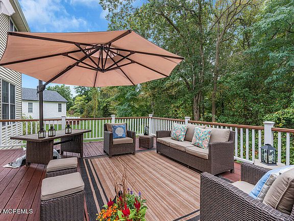 Step into the the large eat-in kitchen boasting a center island that seamlessly connects to the impressive two-story family room with incredible natural light. Sliding doors off the kitchen open to a spacious deck, ideal for outdoor dining and entertaining. The primary bedroom boasts a walk-in closet and a luxurious en-suite bathroom featuring a glass-enclosed shower and soaking tub. The walk out basement with high ceilings provides endless possibilities for additional living space, while the private backyard, bordered by woods provides privacy. Conveniently located close to the GSP, RT 18, Shopping, restaurants and more. Just a few miles to the Jersey Shore.