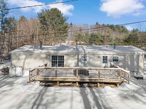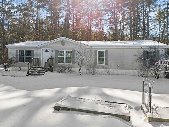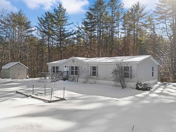 Welcome to this charming and spacious four-bedroom, two-bathroom manufactured home situated on a picturesque 1.55-acre lot. This one-level home offers a well-designed floor plan, perfect for comfortable living. The kitchen boasts ample cabinet and counter space, along with an eat-in dining area, while the family room near the front entrance provides flexibility as a dining room, office, or bonus room. The large living room features a cozy wood-burning fireplace and glass sliders leading to the back deck, creating the perfect space for entertaining or unwinding. The primary suite offers a full bathroom, double sinks, a soaking tub, and a separate shower. Three additional spacious bedrooms and another full bath ensure room for everyone. Plus, a separate laundry/utility room adds convenience. Enjoy the peaceful, private setting, surrounded by mature trees. The back deck and yard are perfect for outdoor gatherings, and a storage shed offers extra space for tools or equipment. Additional highlights include central air and a new four-bedroom septic and leach field installed in 2022. Located just minutes from I-93, this home offers an excellent commuter location while maintaining the charm of country living. Don’t miss this fantastic opportunity—schedule your showing today! Showings start at the OPEN HOUSE Saturday 2/1 @ 11 am