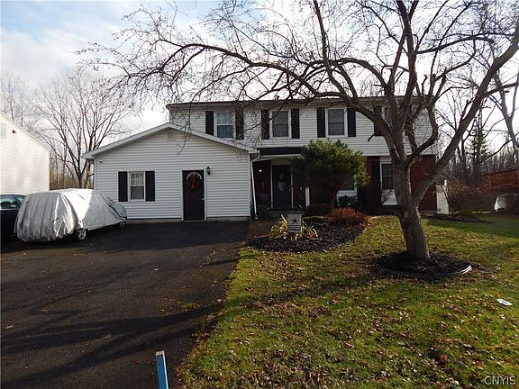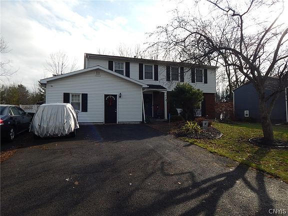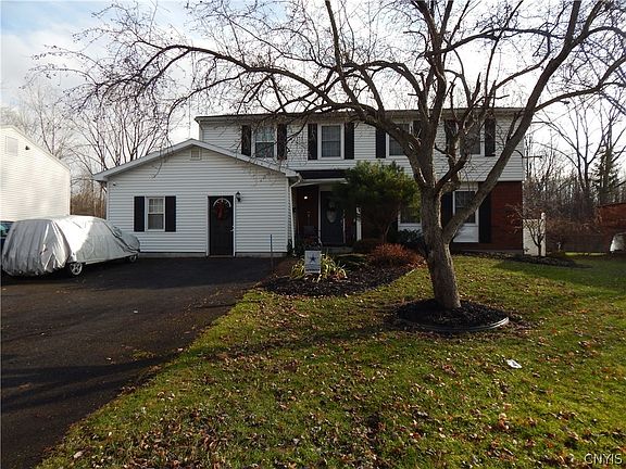 This charming 4 bedroom 2 1/2 bath, 2 story colonial is located in the Liverpool School District. On the exterior, you'll find a 3-car-wide driveway, vinyl siding, a fully fenced backyard with an inground pool and a pool house. On the 1st floor, you'll find a kitchen with solid surface countertops, stainless steel appliances, under-cabinet lighting and an eating area that is open to both the bonus room dining room and living room. The bonus room has cathedral ceilings, a gas fireplace and sliders out to the backyard. The living room has a wood-burning fireplace and slider that also go out to the backyard. The 1/2 bath, foyer, laundry room and exercise room round up the 1st floor. The 2nd floor offers a primary suite with a full bath, walk-in closet and vanity area. There are 3 additional, nicely sized, bedrooms and the main bath. Perfect home for entertaining and large get others. There is also a full basement. The garage was converted into the foyer, first-floor laundry room and exercise area. Conveniently located! ***No showings till Friday, February 10th at 2:00 pm.***