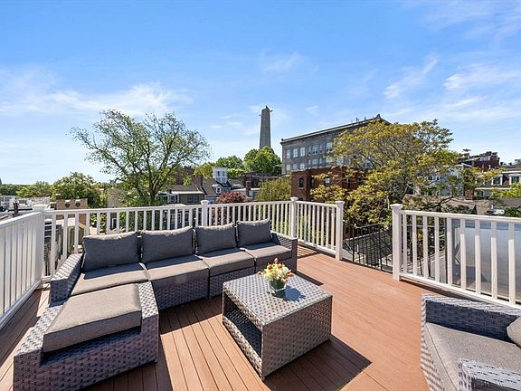 This sunny, 3+BR/2BA PH duplex, is ideally situated near historic Monument Square, and offers expansive living space with high ceilings and a thoughtfully designed layout. Enter into the “great room” to find a beautiful open entertaining space, complete with chef’s kitchen, featuring a white quartz peninsula w/bar seating, white subway backsplash, and stainless-steel appliances, including a 5-burner Thermador range. The spacious living area expands across the whole front side of the home w/three large windows. An elegant dining space w/built-in banquette opens to a private deck w/gas line for grill. The rear bedroom completes this level and serves as a guest room/office with well-appointed full bath nearby. The upper level offers two bedrooms plus nursery/office. The primary bedroom features a beautifully designed walk-in closet and includes an en-suite bath w/tub/shower. A spectacular private roof deck w/Monument views is an entertainer’s dream. Amenities: C/Air, and basement storage.